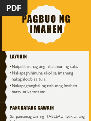 Ano ang iskemang pagbasa a paggamit ng kaalaman b. Ang epektibong pagbuo at paggamit ng imahen ay isa sa mga paksang hindi pangkaraniwang inaaral ng mga bagong manunulat. IMAHEN LAYUNIN Naipaliliwanag ang nilalaman ng tula.