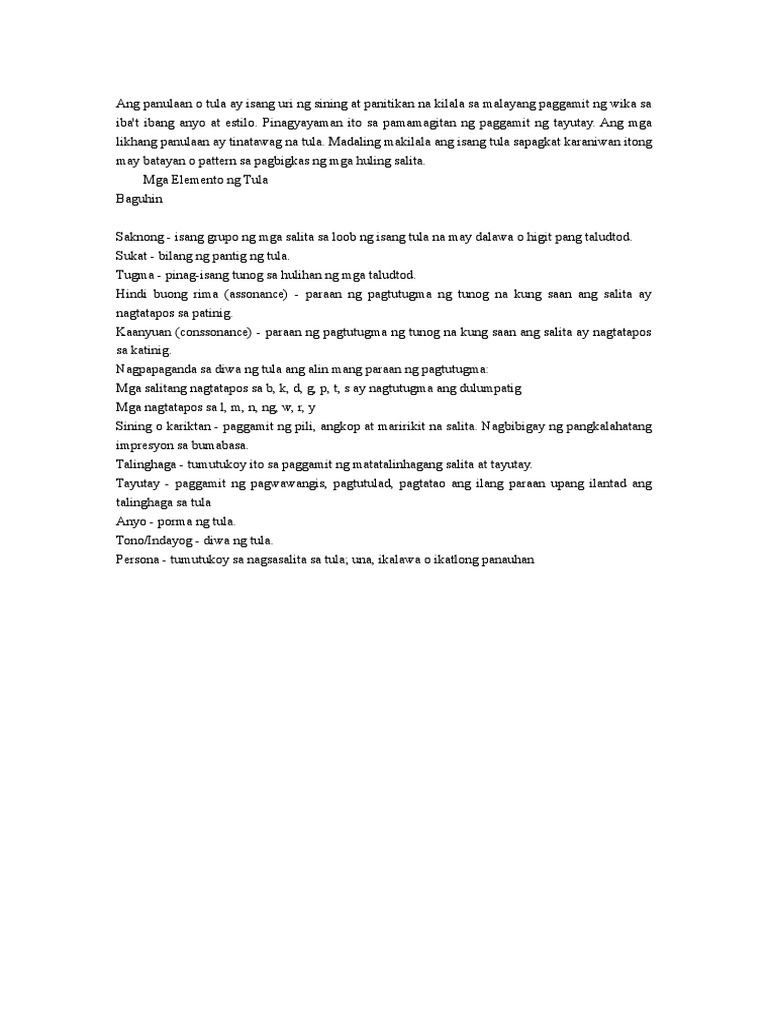 Tumutukoy ito sa paggamit ng tayutay sa tula. TonoIndayog Diwa ng tula. Ang Tula o poem sa ingles ay isang uri sining o panitikan na kilala dahil sa malayang paggamit ng wika sa ibat ibang anyo at estilo. 12 example NG sukat tugma tulang.